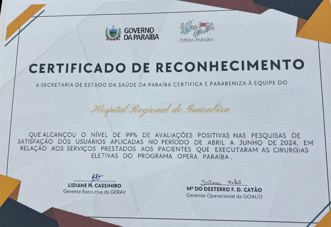 O Hospital Regional de Guarabira (HRG)  recebeu, nesta quinta-feira (25), certificado de reconhecimento da Secretaria de Estado da Saúde (SES) por ter alcançado o nível de 99% de avaliações positivas nas pesquisas de satisfação dos usuários em relação aos serviços prestados aos pacientes que se submeteram às cirurgias eletivas do programa Opera Paraíba, do Governo do Estado.